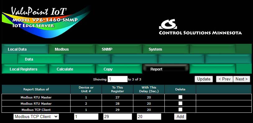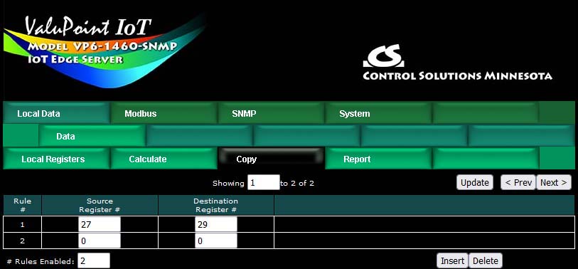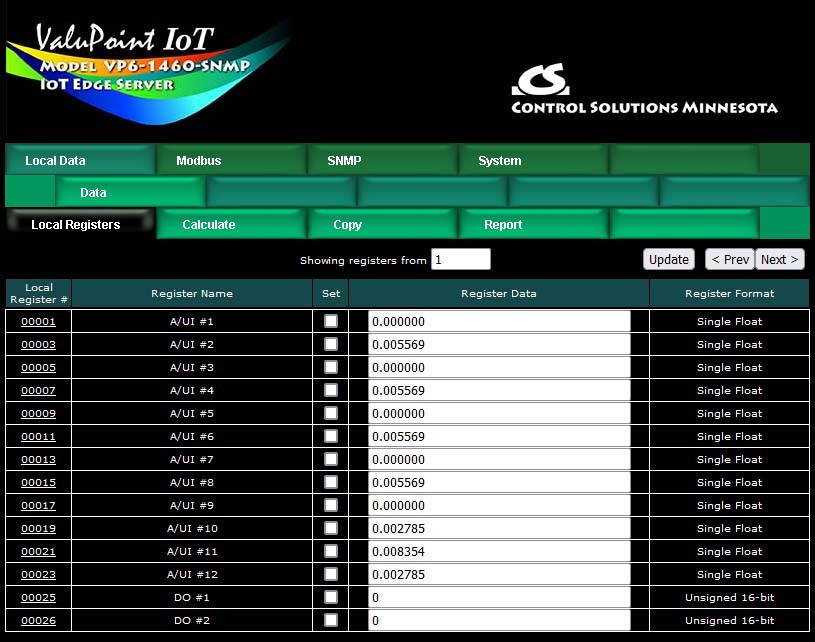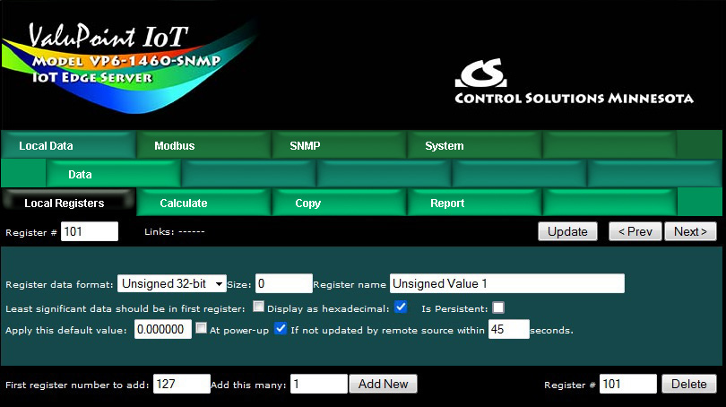 Control Solutions devices originally came with a predefined set of local registers that were accessible externally as Modbus registers. Newer models take a completely different approach to defining registers. When you first take the ValuPoint out of the box, it has no registers except for the initial set of registers assigned to the physical I/O points. You get to create remaining registers as you need them, and several data formats are supported, from 16-bit to 64-bit, both integer and floating point.