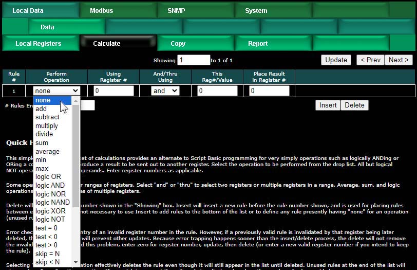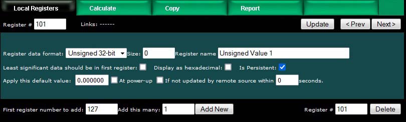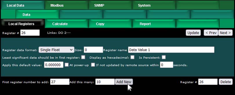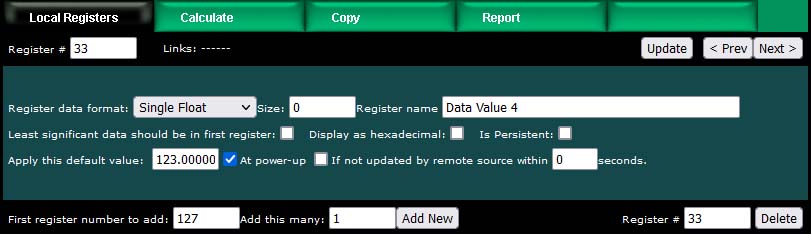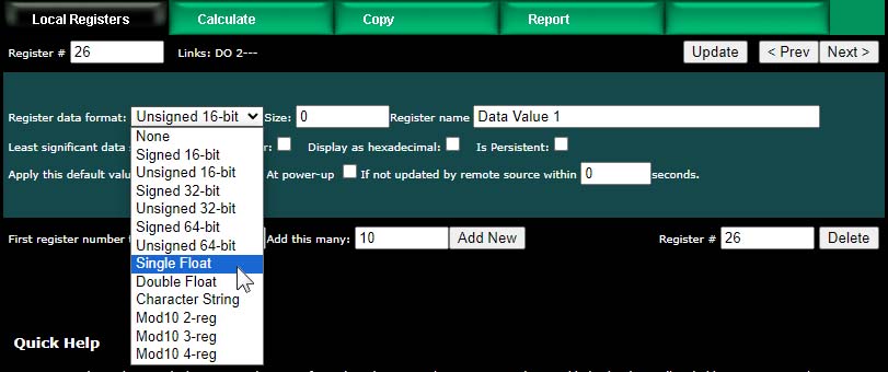 Upon clicking a register number, the register detail will be displayed. This can be either detailed configuration of an existing register, or detail about new registers you are about to add. The only time you can select the data format is when adding new registers. Once the registers are created, the data format cannot be changed because this impacts how many Modbus registers are actually used. If you had a set of 16-bit registers defined, and wanted to change one of them to 32-bit, it would cause all of the remaining registers to be renumbered if such a change was allowed. While this may seem harmless at first, it becomes a huge mess trying to keep track of where in all the rules the existing numbers needed to get changed. Therefore, such changes are prohibited.