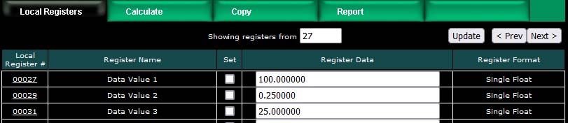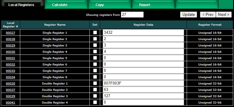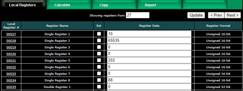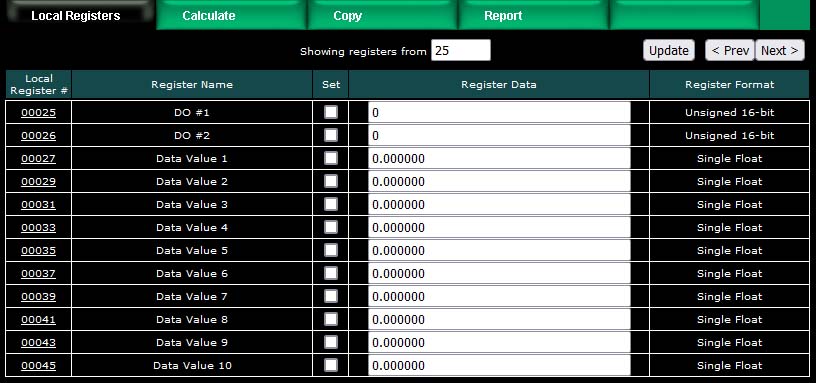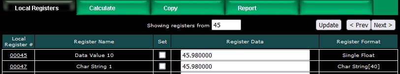 We have now created 10 new floating point registers. The important thing to observe here is the register numbers in the first column. Remember that Modbus protocol assigns register numbers (or addresses) in 16-bit increments. Since single precision floating point registers are 32-bit registers, each floating point value occupies 2 spots in the Modbus register map. The local register number assignments reflect this fact.