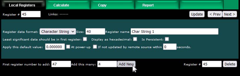 After clicking Add New, we now see our character string registers in our register list (click on the Local Registers tab to get back to the register list). Note that the register numbers increment by 20 to accommodate our 40-character strings.