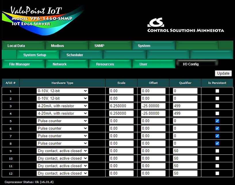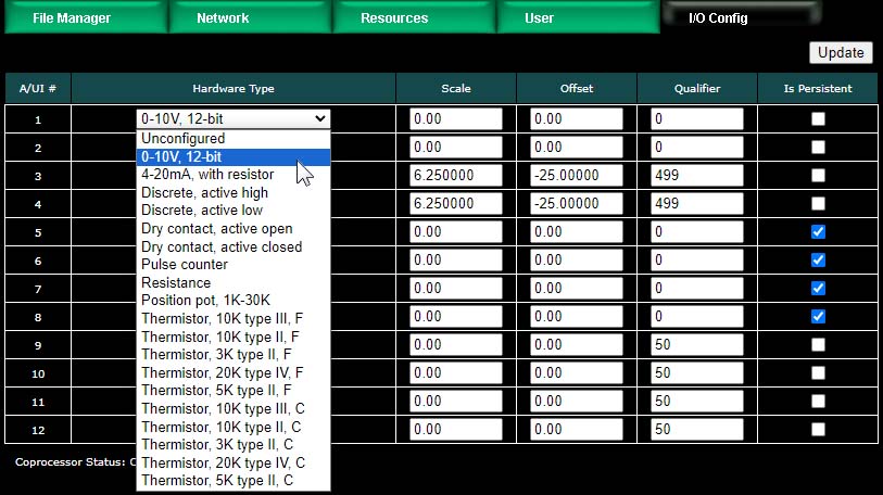 The relay outputs do not require any configuration. The analog/universal inputs do require configuration on the I/O Config page. Select the desired input type and enter additional parameters as applicable.