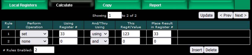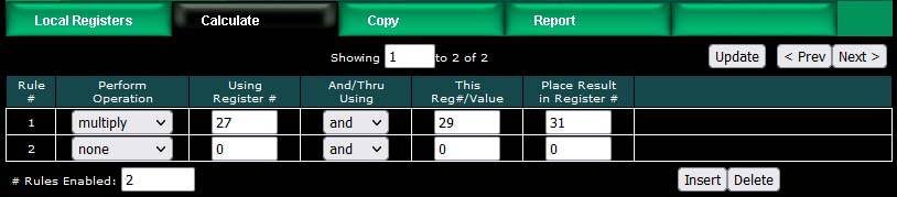 The ValuPoint includes the ability to do simple calculations based on simple template rules. Select the operation, one or two operands as applicable, and a register to place the result in. Operations like "multiply" will use registers A "and" B. Operations like "sum" can add up the contents of a series of registers by selecting "thru" instead of "and".