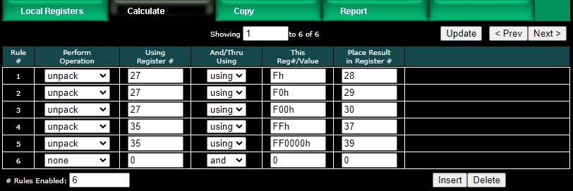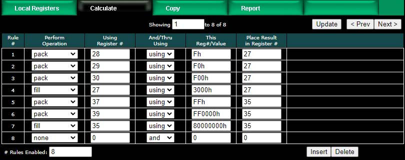 The example below shows the content of result registers 27 and 35 using the above calculate rules and the local register values shown. The contents of registers 28, 29, and 30 are packed into register 27. The contents of registers 37 and 39 are packed into 35 (all 32-bit register pairs).