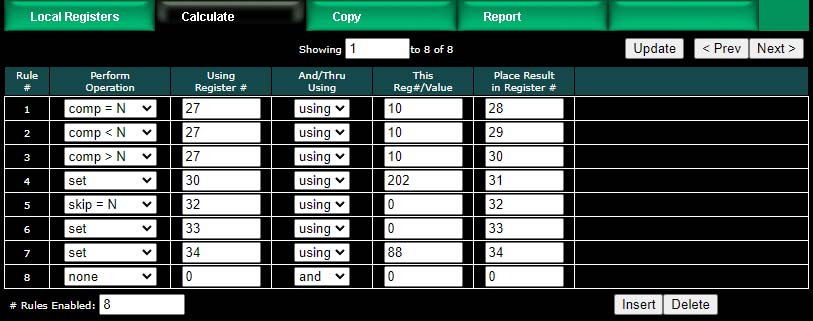 The next two screen shots illustrate compare, set, and skip operations. Rule 5 says that rule 6 will not be executed if register 32 contains a zero. If register 32 is not equal to zero, then rule 6 will be executed.